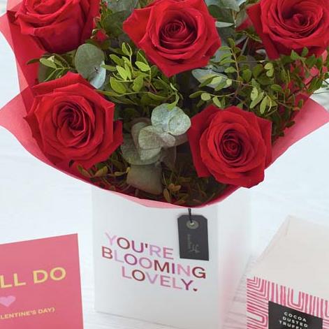 A gift set of 6 stunning red roses accompanied by a love greetings card and sumptuous heart chocolates.